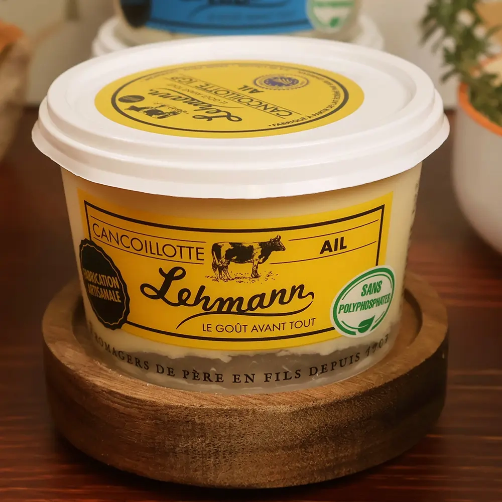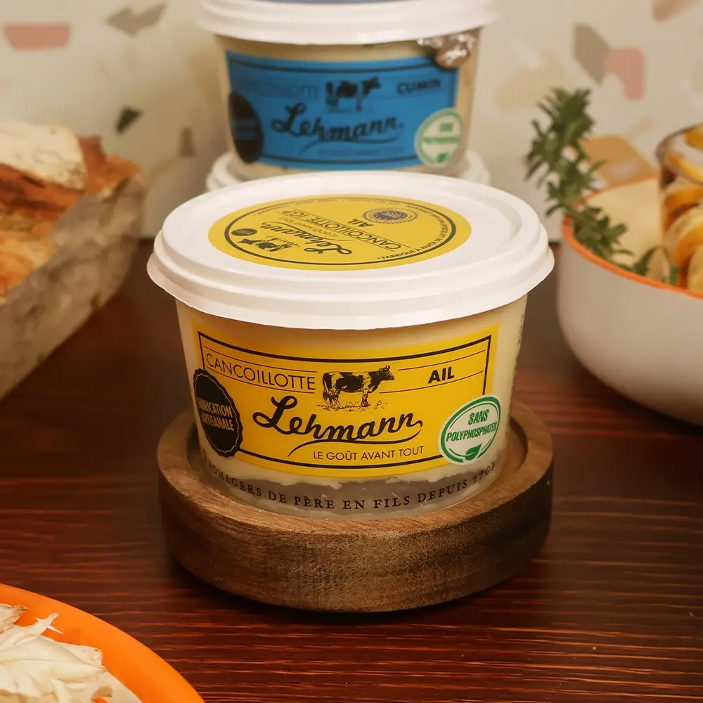 C’est à cette étape que l’ail est ajouté, sous forme d’ail en poudre sélectionné. La cuisson lente permet aux arômes de se diffuser uniformément, sans dominer. La cancoillotte est ensuite conditionnée immédiatement, pour préserver sa fraîcheur et son onctuosité. Ce procédé artisanal garantit une saveur stable et une qualité constante.