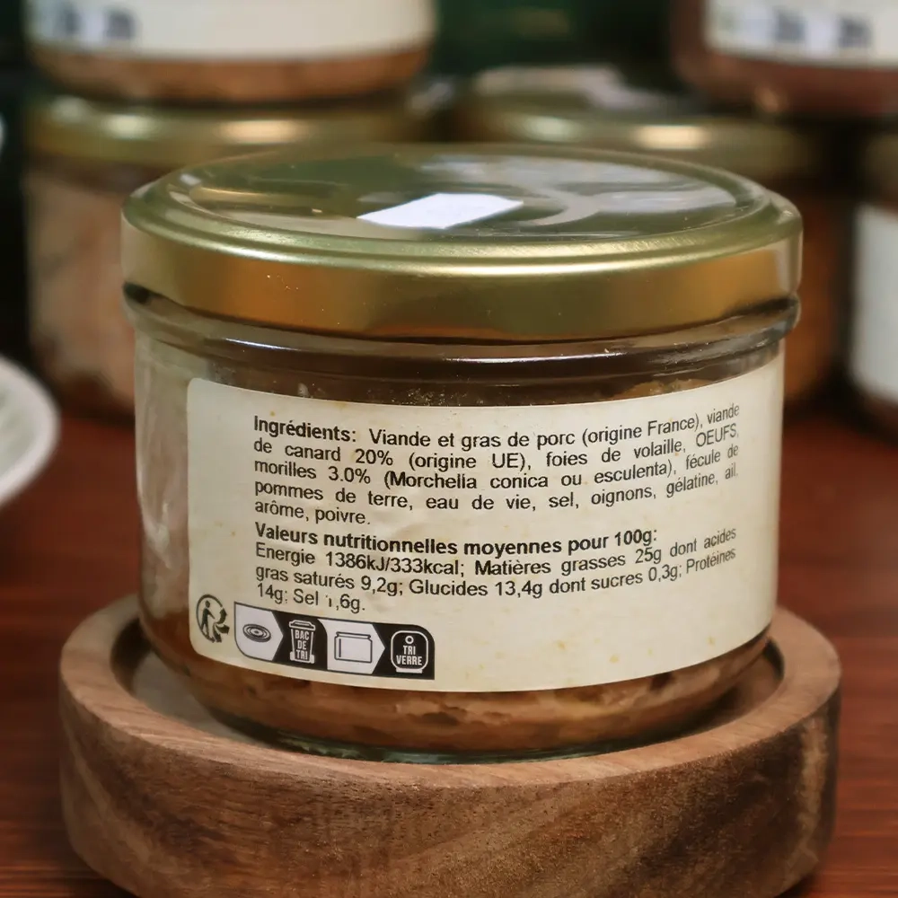 Préparée à partir de viande de canard de haute qualité et agrémentée de morilles sauvages, cette terrine se distingue par sa richesse aromatique. La morille, champignon rare et apprécié pour ses notes boisées, ajoute une profondeur unique à la terrine, tandis que la viande de canard offre une texture fondante et un goût puissant. Ensemble, ils forment une harmonie de saveurs, marquée par des notes de sous-bois et une touche de douceur naturelle.