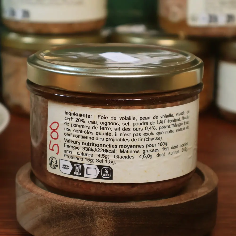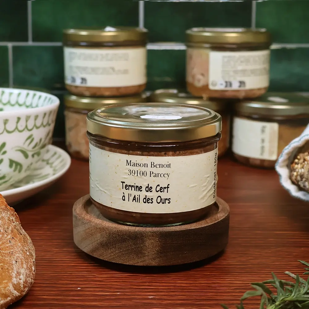 La Terrine de Cerf à l'Ail des Ours allie la robustesse de la viande de cerf aux arômes frais et délicatement aillés de l'ail des ours. Cette spécialité de gibier est parfaite pour ceux qui apprécient les saveurs profondes, rehaussées par une touche végétale et parfumée, typique de l'ail des ours.