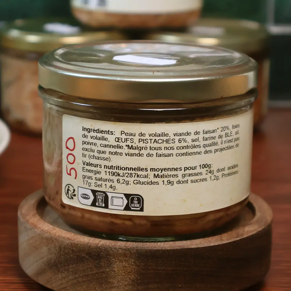 Élaborée selon des méthodes artisanales, cette terrine met en valeur la qualité de ses ingrédients. La viande de faisan, sélectionnée avec soin, est préparée de manière à préserver toute sa finesse aromatique. Les pistaches sont incorporées entières afin de conserver leur texture croquante et leur saveur délicate.